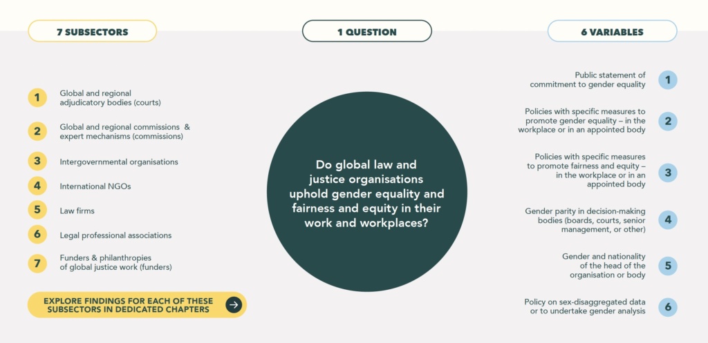 We review the gender-related policies and practices of 171 global organisations active in the global law and justice sector. This page presents an overview of the research framework, sampling framework, and data collection and validation methods.