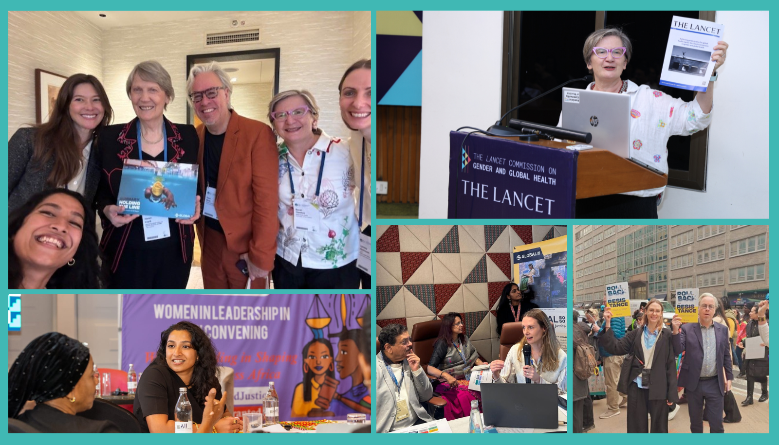 A collage of photos of the Global 50/50 collective at various events across 2025 including the World Health Summit, the Launch of the the Lancet Commission on Gender and Global health, and on the streets of New York during CSW69.