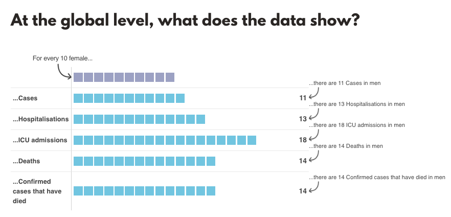 Ravi: Tracking over 170 countries across the world, the dashboard represents the first systematic data-gathering process to understand how men and women are being differentially impacted by COVID-19. Overall, while cases are evenly reported among both men and women, men account for 40 percent more COVID-19 deaths. Gendered differences exist along the clinical pathway, from testing through to intensive care admissions.